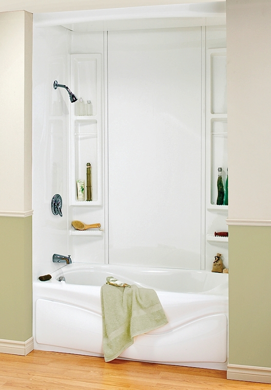 Five-piece wall, two towel bars, six shelves, high gloss, smooth finish. Can accommodate shower. 80 in Height. 1 year warranty.