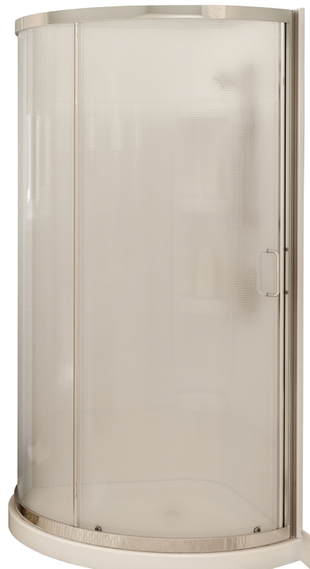 34 in x 34 in wall width round base, low 3 in threshold allowing an easy and safe access, smooth and silent roller system, chrome frame, 4 mm tempered glass, left or right shower door opening. 76 in H. 3 years warranty. Two-piece polystyrene wall with four shelves, acrylic/ABS textured base.