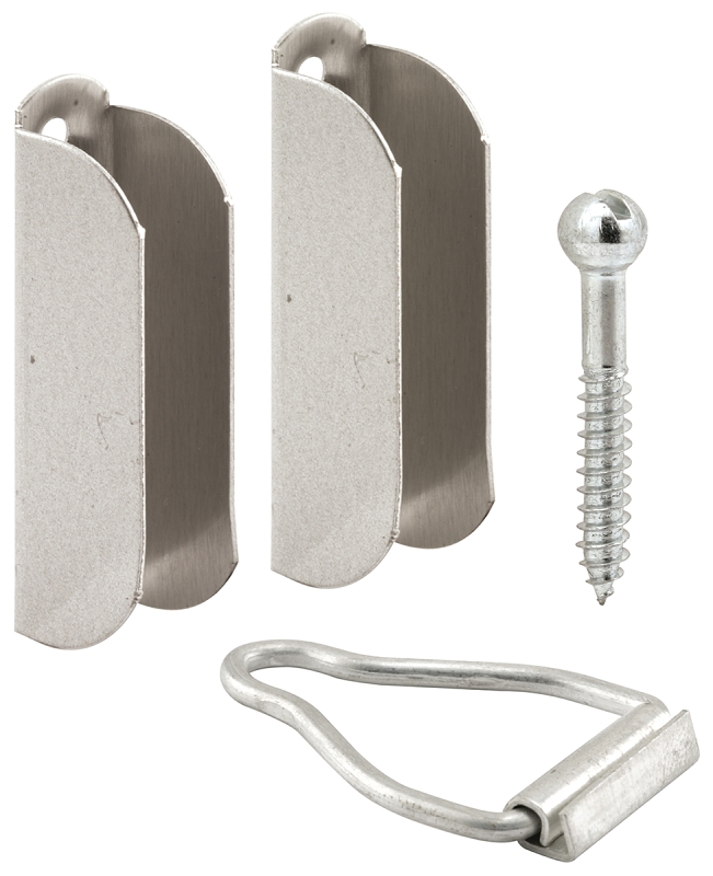 Prime-Line stamped aluminum top hangers and bottom latch hardware are used to install 3/8 in thick window screens to wood framed windows. Set includes 2 top hangers and 1 spine-in bail latch, 1 set per card includes fasteners. Mill (silver) finish.