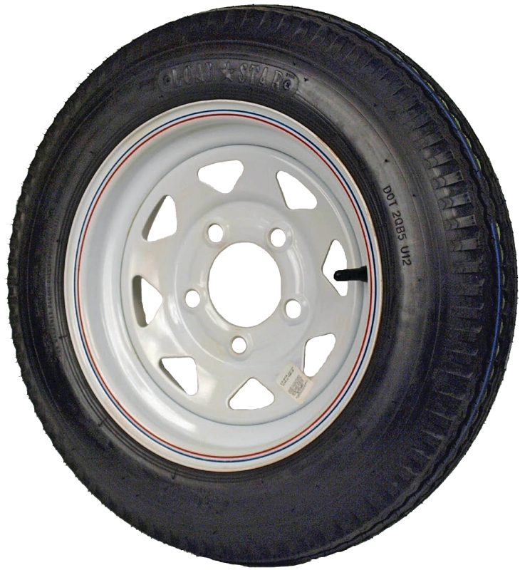 For utility, RV and boat trailers. Bias ply tire. Custom spoke white wheel. 1120 lb. capacity at 60 psi. Meets DOT requirements.