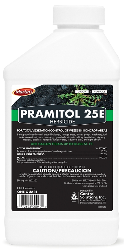 Martin’s Pramitol 25E concentrate is a bare ground herbicide and an industrial weed killer that acts as a soil sterilant preventing plant growth for up to 1 year from application. For use in rock beds, driveways, construction sites, pipe yards and other commercial areas. Controls hard to kill Johnson grass and Bindweed. One quart treats up to 2,500 square feet. Ingredients: Prometon 25%.