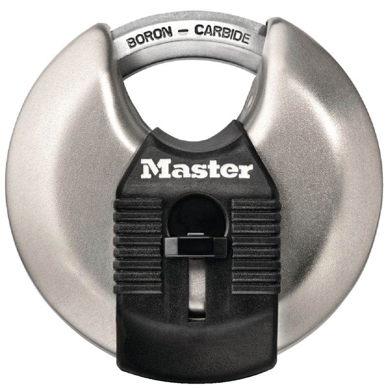 The Master Lock Magnum® No. M40XKAD discus padlock features a 2-3/4 in wide stainless steel body for maximum strength, reliability and corrosion resistance. The fully shrouded design minimizes shackle exposure and protects against bolt cutter attacks. The 3/8 in Dia octagonal shackle is 5/8 in long and made of tough-cut™ boron-carbide, 50% harder than hardened steel, offering maximum resistance to cutting and sawing. The 4-pin cylinder prevents picking and the dual locking ball bearings provide maximum resistance against prying and hammering. The covered keyway offers maximum weather protection and reinforced body bumper protects against scratches. The lifetime assurance provides peace of mind from a brand you can trust.