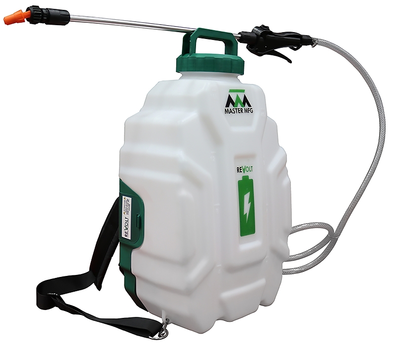 Strap yourself in and make spraying a breeze with the Master Manufacturing 4 gal rechargeable lithium-ion backpack sprayer, REVOLT series. Designed for the homeowner and commercial user, this rechargeable lithium-ion backpack sprayer is light as a feather and has incredible comfort with adjustable shoulder straps. No pumping or wires are required, making it more convenient than ever to move about with your spraying. Featuring an Everflo 1 gpm diaphragm pump that is isolated internally in backpack. The REVOLT backpack sprayer is equipped with a standard pistol grip spray gun that goes from stream to mist, a sturdy 6 in fill lid for gun storage and transportation, a translucent tank for easy filling, a 5 ft braided nylon hose for hard to reach areas and an easy to reach lighted power switch. Approved for use with Round-Up and other agricultural brand herbicides and insecticides. Backed by a two-year warranty on pump and components.