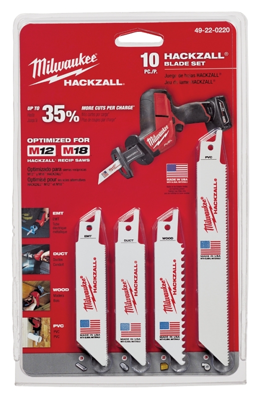 Thin kerf for up to 35% more cuts per charge. Short blade length for cutting in tight locations. Bi-metal construction for increased tooth durability and long blade life. Set includes (2) wood blades, (3) EMT blades, (2) duct blades, (3) PVC blades and storage pouch.