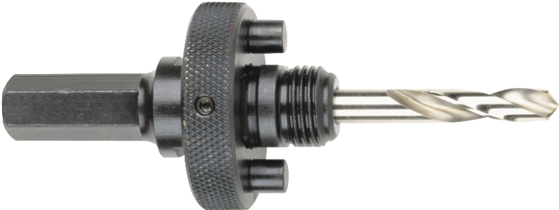 Backing plate is equipped with spring-loaded snap pins which lock into holes on the backing plate for positive efficient transmission of torque. It can be used in 1/2 in capacity drills and larger, arbor has a 5/8-18 thread. Pilot bit used in applications on wood and metal.