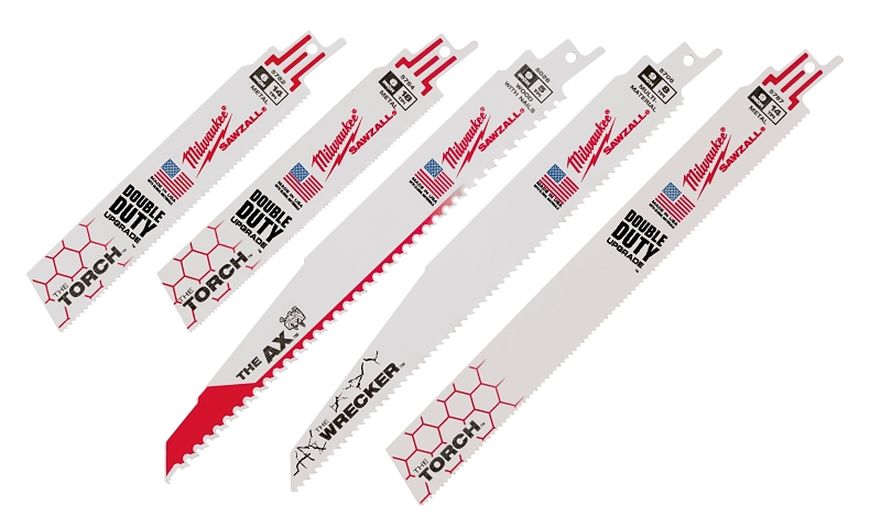 The Milwaukee five-piece Demolition Sawzall® blade set features an assortment of our most popular demolition blades for a broad range of professional applications. Milwaukee demolition blades are thicker for maximum durability and taller for straighter cuts. The set features the Ax™ for cutting nail-embedded wood, The Wrecker™ for multi-material demolition cutting and The Torch® for metal cutting.