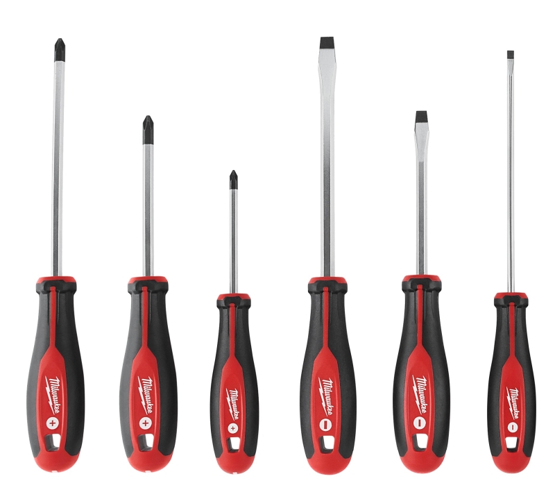 Milwaukee Screwdriver Kit, Specifications: Phillips and Slotted Tip, 5/16 in Tip Size, Dimensions: 14 in L x 1.4 in W x 7.1 in H, Number of Pieces: 6, Includes: (1) #1 x 3 in Phillips, (1) #2 x 4 in Phillips, (1) #2 x 6 in Phillips, (1) 1/4 x 4 in Slotted, (1) 3/16 x 6 in Slotted, (1) 5/16 x 6 in Slotted Screwdrivers