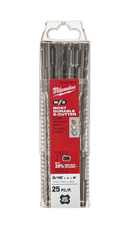 MILWAUKEE® M/2™ two cutter SDS Plus rotary hammer-drill bits are up to 30% faster with up to 20% more holes per charge in cordless rotary hammers. Breaker point pulverizes the material more effectively, resulting in faster drilling speeds. The variable flute allows for maximum debris extraction leading to up 20% more holes per charge in cordless rotary hammers while making it a very durable bit in corded and cordless rotary hammers. The enhanced rebar guards provide increased durability in hard aggregate and rebar. Additionally, M/2™ features a centering tip for exact spot drilling, wear mark indicator indicating when the bit no longer meets ANSI diameter requirements and a reinforced flute for durability and minimized vibration. The increased life and efficiency of the M/2™ two cutter drill bit line provides the ideal solution in general concrete for cordless and corded rotary hammer users.