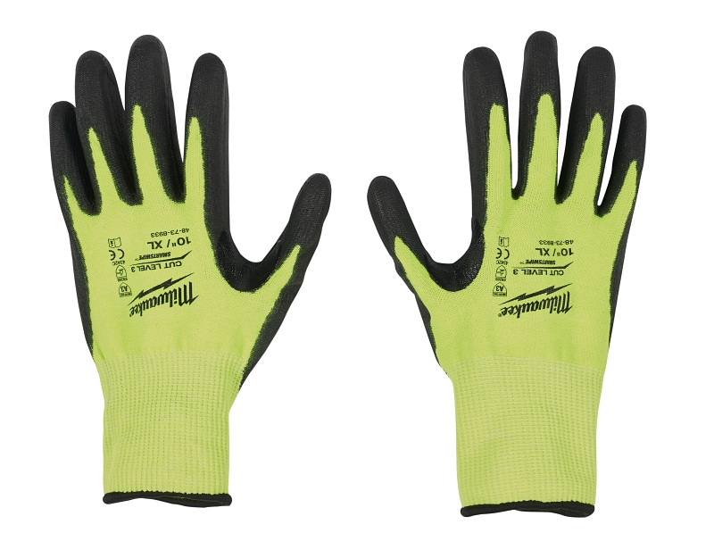 Our high-visibility cut level 3 polyurethane dipped gloves are designed to provide a better fit and better protection. These hi-vis cut-resistant gloves have a reinforced nitrile coating between the thumb and index finger for enhanced durability in high wear points. The cut-resistant gloves feature SMARTSWIPE™ touchscreen compatible fingertips. The cut level 3 gloves are knit with 15 ga for better dexterity when handling small objects. These breathable gloves are lightweight for comfortable all day wear. MILWAUKEE® offers hi-vis gloves in sizes ranging from S to XXL so you can get your perfect fit. Milwaukee high-visibility gloves feature color ID bands for you to easily identify cut levels.