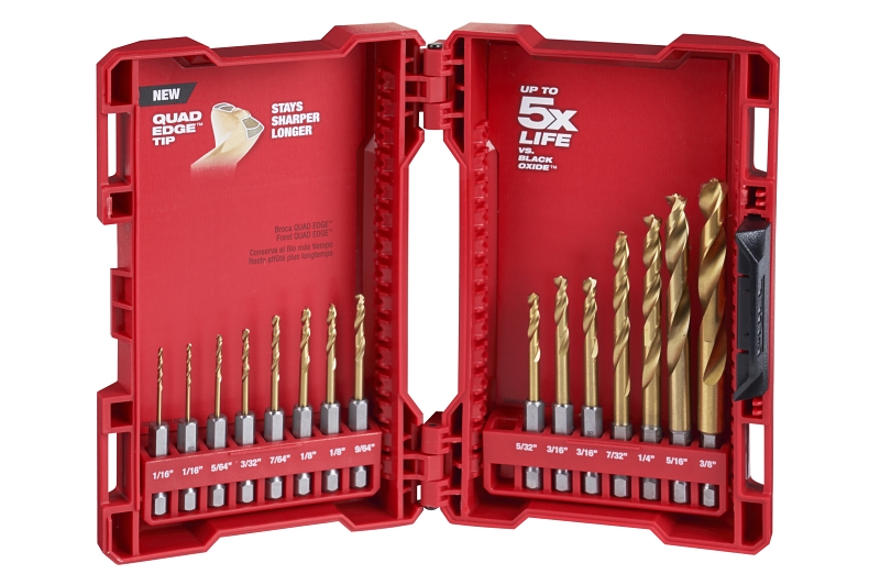 Our MILWAUKEE® SHOCKWAVE Impact Duty™ 15PC RED HELIX™ titanium drill bit set is engineered for extreme durability and long life. The QUAD EDGE™ tip delivers a precision start and features four cutting edges to create smaller chips for faster material removal and less heat leading to improved performance. Designed with a VARIABLE HELIX™ flute that begins with an aggressive 35 deg helical angle and ends at 15 deg for rapid chip removal. The bits also feature an internal thicker tapered web that greatly increases strength, reducing premature breakage. Ideal for various applications including but not limited to wood, plastics and metals. MILWAUKEE® RED HELIX™ titanium drill bits provide up to 5X life vs black oxide drill bits. Set is organized in a customizable accessory case designed for use in PACKOUT™.