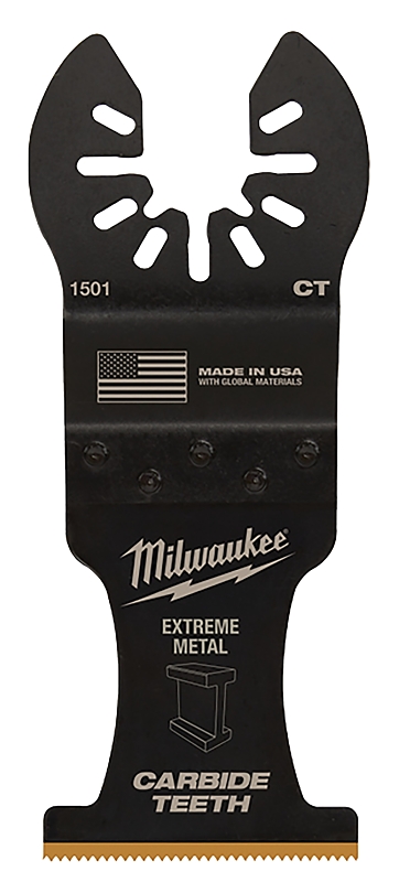Our universal fit OPEN-LOK™ titanium enhanced carbide teeth extreme materials blades for oscillating multi-tools are designed for use in the most Extreme material cutting applications. For use in wood, screws, nails, cement board, plaster and other cutting applications, the titanium enhanced carbide teeth extreme materials blade is complete with a thinner blade and unique aggressive tooth design that offers faster cutting performance in wood when compared to the standard carbide blade. The extreme materials carbide teeth blade lasts up to 50X longer than standard bi-metal blades and can be used in a wide range of materials. These Milwaukee® multi-tool blades are designed and made in the USA with global materials.