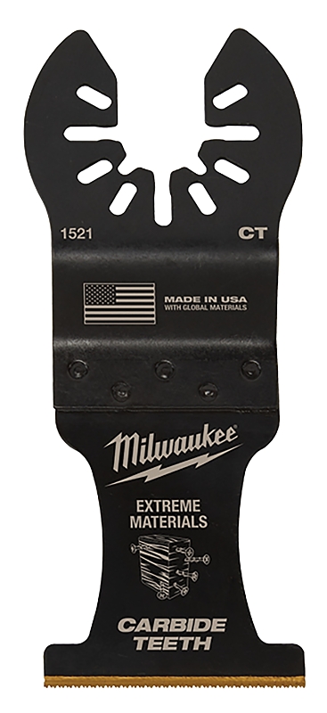 Our universal fit OPEN-LOK™ titanium enhanced carbide teeth extreme materials blades for oscillating multi-tools are designed for use in the most Extreme material cutting applications. For use in wood, screws, nails, cement board, plaster and other cutting applications, the titanium enhanced carbide teeth extreme materials blade is complete with a thinner blade and unique aggressive tooth design that offers faster cutting performance in wood when compared to the standard carbide blade. The extreme materials carbide teeth blade lasts up to 50X longer than standard bi-metal blades and can be used in a wide range of materials. These Milwaukee® multi-tool blades are designed and made in the USA with global materials.