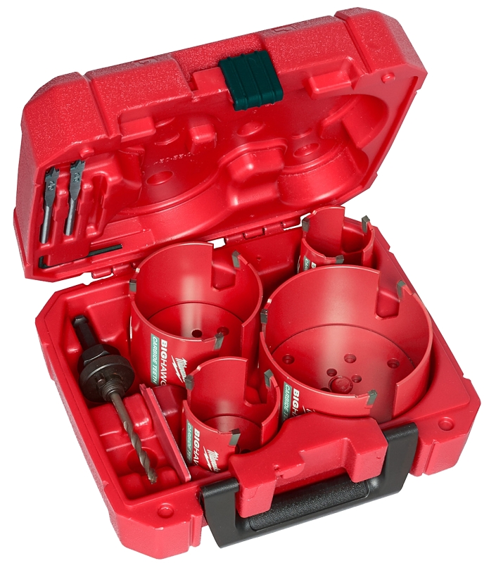 Our MILWAUKEE® BIG HAWG™ with carbide teeth is the excellent hole saw solution for nail-embedded wood and abrasive material applications. Our first-to-market hole saw offers extreme life utilizing advanced carbide technology. The BIG HAWG™ gives users 50X more life in demanding applications with the ability to cut 1000+ more nails. The heavy-duty hole saw has 10X larger carbide teeth that rip through materials five times faster. Deeper slots allow for fast and easy plug removal. Our BIG HAWG™ hole saw is the excellent solution for cutting through the toughest materials, including nails, cement board, shingles, plaster and stucco. Our kit includes four BIG HAWG™ hole saws, two pilot bits an arbor and a diamond file.