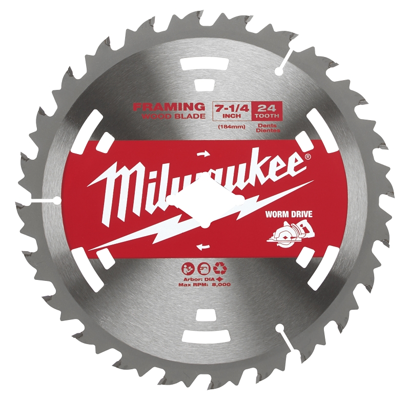Milwaukee Circular Saw Blade, 7-1/4 in Diameter, Carbide Cutting Edge, ATB Teeth, 24 Teeth, 5/8 in Arbor, 8000 rpm Speed, 20 deg Hook Angle, 1.6 mm Kerf, Steel, Applicable Materials: Hardwood, LSL, LVL, Laminated Wood, OSB, OSL, PSL, Plywood, Softwood, Treated Lumber