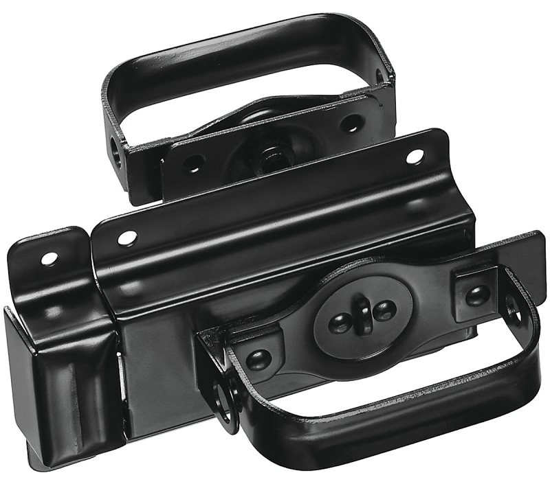 Designed for swinging doors on storage sheds barns, out-buildings and more. Designed for right or left handed applications. Latches automatically. Can be padlocked for added security. Handle is designed to prevent flattening if door slams against building. Can be operated from either inside or outside of door. Wide strike allows for door sag. Bolt has rounded face for easy latching. Bracket is provided to hold door open. Visual pack.