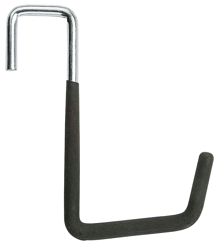 Hangs heavy tools, ladders and other equipment. Hangs over rafters without the need of fasteners. Non-mar coating protects tools and equipment. Black vinyl coating. Safe working load limit of 50 lb. Boxed loose.