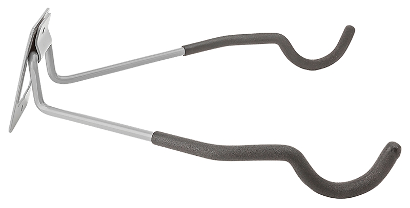 Designed to hold bikes for easy storage in a garage or other storage area. Flips up against the wall when not in use. Mounting hardware included. Safe working load of 20 lb. Black vinyl coated. Boxed loose.