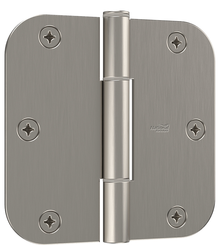 National Hardware Squeak Guard Door Hinge, 50 lb Weight, Door Leaf Height: 3-1/2 in, Door Leaf Thickness: 3/32 in, Frame Leaf Height: 3-1/2 in, Frame Leaf Thickness: 3/32 in, Pin Type: Removable, Pin Diameter: 13/32 in, Screw Mounting, Number of Mounting Holes: 6, Mounting Hole Diameter: 1/8 in, Hole Spacing: 2-13/16, 1-13/32, 2-1/8 in, Corner Radius: 1/4 in, Steel, Satin Nickel, Dimensions: 3-1/2 in H x 3-1/2 in W, Includes: Mounting Hardware