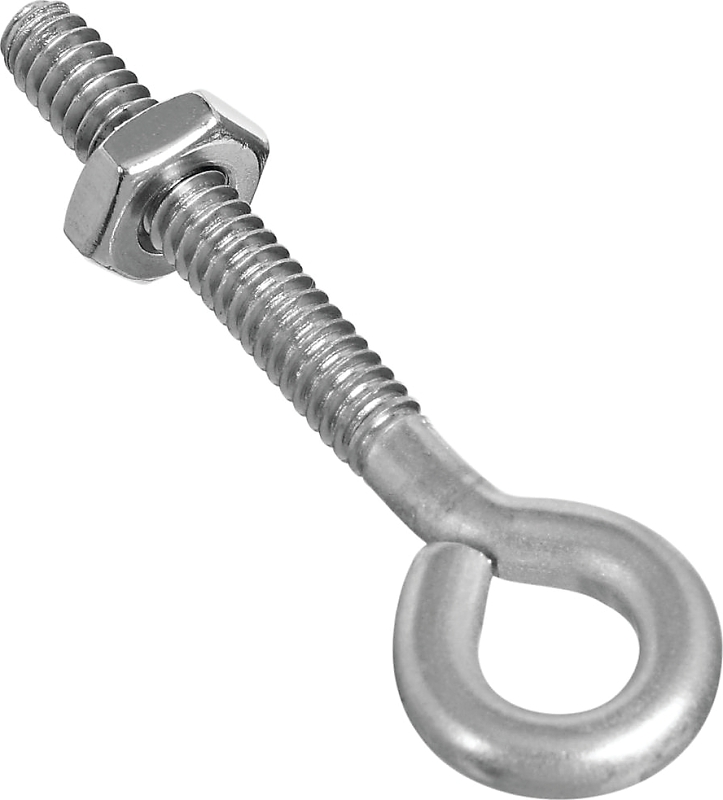 National Hardware Eye Bolt, Thread Size: #10-24, Thread Length: 1-1/4 in, Shank Diameter: 0.16 in, Shank Length: 1.41 in, Eye Diameter: 0.28 in ID, 2 in OAL, Working Load Limit: 65 lb, Stainless Steel, Stainless Steel, Includes: Hex Nut