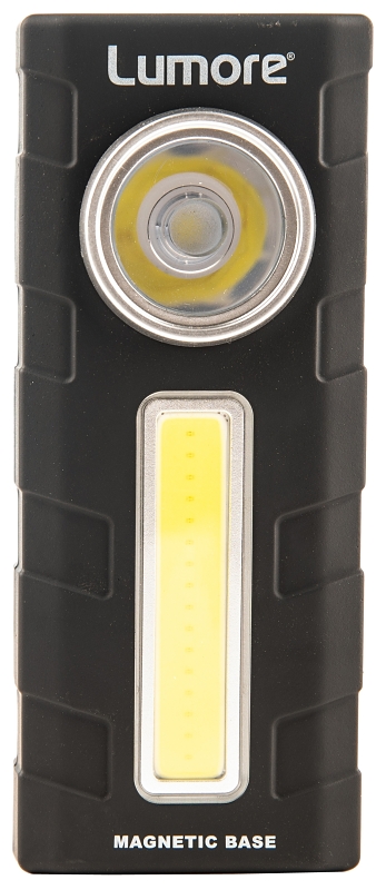 Nebo LUMORE 2-in-1 Work Light with Magnetic Clip Hook, Battery Voltage: 4.5 V, Number of Batteries: 3, Lamp Type: LED, Number of Lamps: 2, Light Color: White, Lumens: 300, 250 Lumens, Plastic, Black, Dimensions: 5.5 x 2 x 8 in, Includes: (3) Batteries