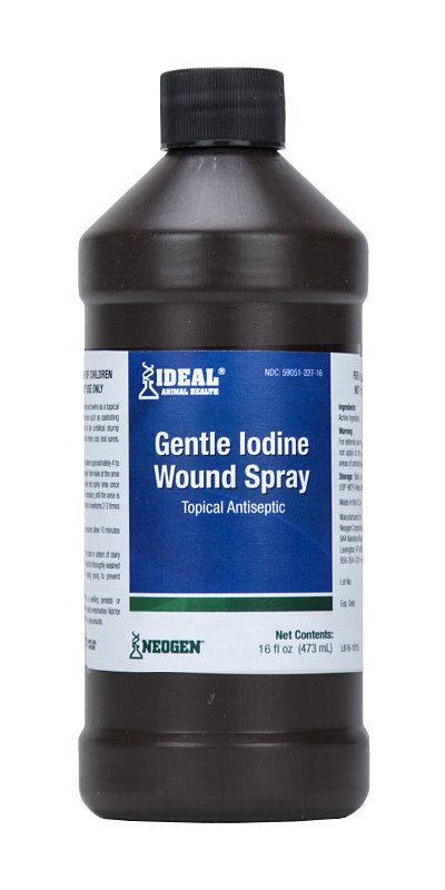 Gentle iodine wound spray is a topical antiseptic of 1% titratable iodine for use on horses, cattle and swine. May be used prior to surgical procedures such as castrating and tail docking, for application to the umbilical stump (navel) of newborn animals and for minor cuts, teat sores, bruises and abrasions.