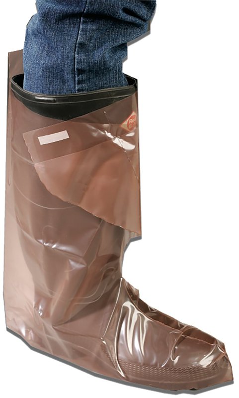 Developed for protective and sanitary use in farm and industrial applications, the disposable MaxiBoot is made from a dark brown blended polymer film. It is available in 4 mil (heavy-duty) film thickness. The calf length boot is extra tall (18 in). The MaxiBoot has a unique press-tab fastener closure.
