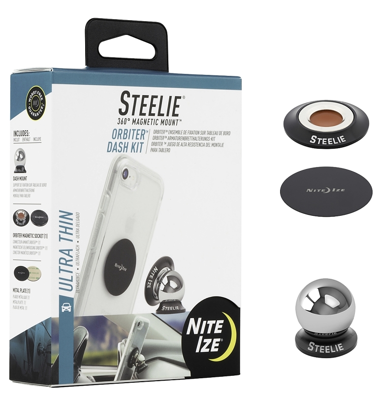 This powerful magnetic phone mounting system allows you to easily attach, detach and rotate your phone on the dash mount. The low-profile metal plate adheres to your phone or case, creating a secure magnetic connection with the Orbiter magnetic socket. By combining high-friction materials with magnetic strength, the Orbiter keeps your phone secure and accessible. The Steelie Orbiter dash mount kit keeps your phone conveniently accessible on the dash while letting you easily adjust your screen for the perfect viewing angle. This kit combines a dash mount with the powerful Orbiter magnetic socket and a low-profile metal plate that easily attaches to your phone or case. Our dash mount adheres on any vehicle dash with strong, removable 3M™ VHB® adhesive for a secure hold. The Orbiter magnetic socket attaches to the dash mount using a powerful neodymium magnet and silicone center for a secure connection and smooth glide. By combining magnetic power and a thin high-friction ring designed to prevent slipping, the phone docking surface of the Orbiter magnetic socket holds your phone securely in place. Once the dash mount and Orbiter magnetic socket are affixed to your vehicle dash, simply adhere the low-profile metal plate to your phone or case and you’re ready to quickly attach, detach and rotate your phone for the perfect viewing angle.