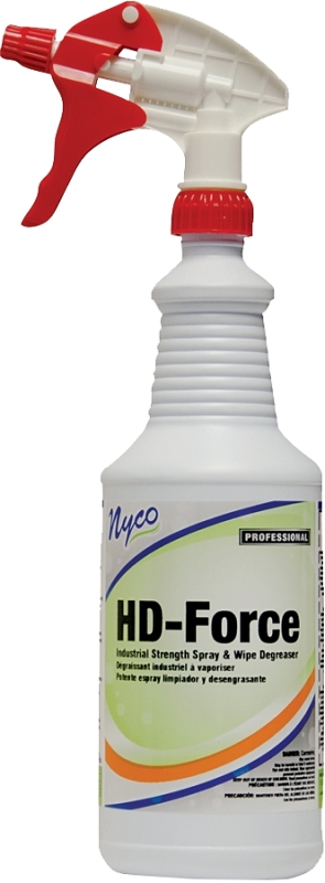 HD-Force is a super-strength spray and wipe degreaser for tackling the toughest cleaning jobs. Ready to use convenience. It cuts through grease, oil, tar, ink, crayon, wax, silicone, resins, adhesives and burned-on carbonized soils. Penetrates and works quickly to remove heavy buildups. Excellent for use in manufacturing plants, kitchens, food processing or other areas where maximum strength cleaning is required. Ideal for cleaning grease from equipment, machinery and tools.