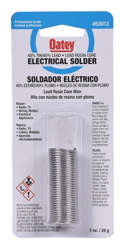 Oatey® rosin core wire solder is a tin-lead alloy wire solder with a rosin flux core for use in electrical applications, including wiring and other fine electronic work.