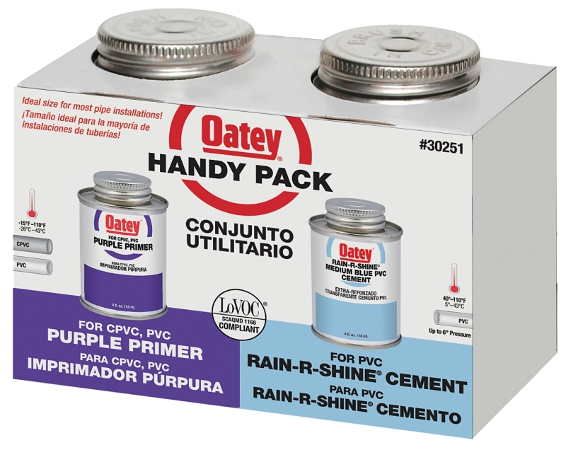 Oatey Handy Pack, Includes: 4 oz All-In-1 Purple Primer, 4 oz Rain R Shine Medium Blue PVC Cement