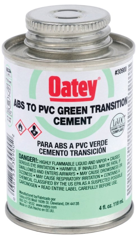 Medium bodied, green PVC resin in solvent solution formula for use in joining all schedules of ABS to PVC pipe and fittings up to 6 in Dia in non-pressure transition joints. Recommended application temperature is 40 to 110 deg F. Meets ASTM D-3138.