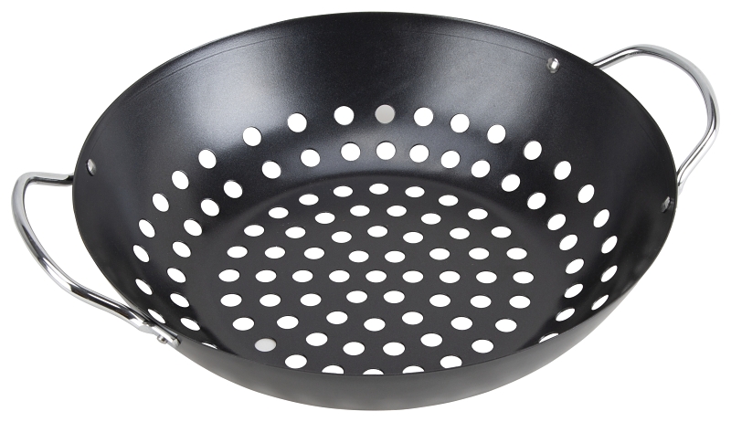 Basket design allows easy stirring while cooking. Holes allow grill flavor to permeate thru the food. Sturdy steel basket with side handles allows easy lifting.