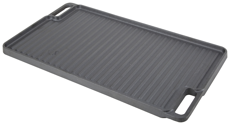 This grill plate has two reversible cooking surfaces and built-in handles for easy and secure lifting. Size: 17-3/4 in x 10 in.