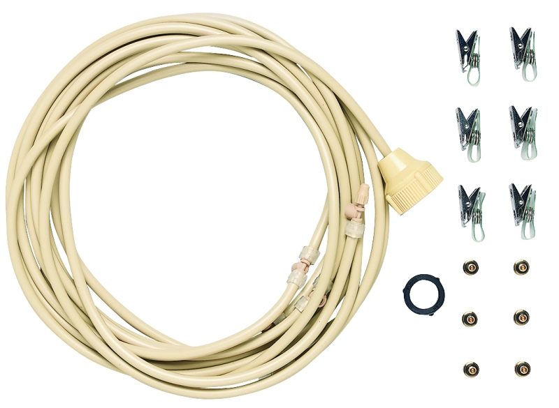 Orbit Irrigation Products Mini Portable Mist Cooling System, 1/4 in Connection, 10 ft Coverage Area, Temperature Rating: 20 deg F, Includes: (1) 10 ft Flexible UV Treated 1/4 in Feed Line, (6) Alligator Hanging Clamps, (1) 10 ft UV Treated 1/4 in Tubing Mist Line, (6) Rotatable Fittings, (6) 10/24 Thread Mist Nozzles, (1) 1/4 X 3/4 in Hose Adapter and (1) End Fitting