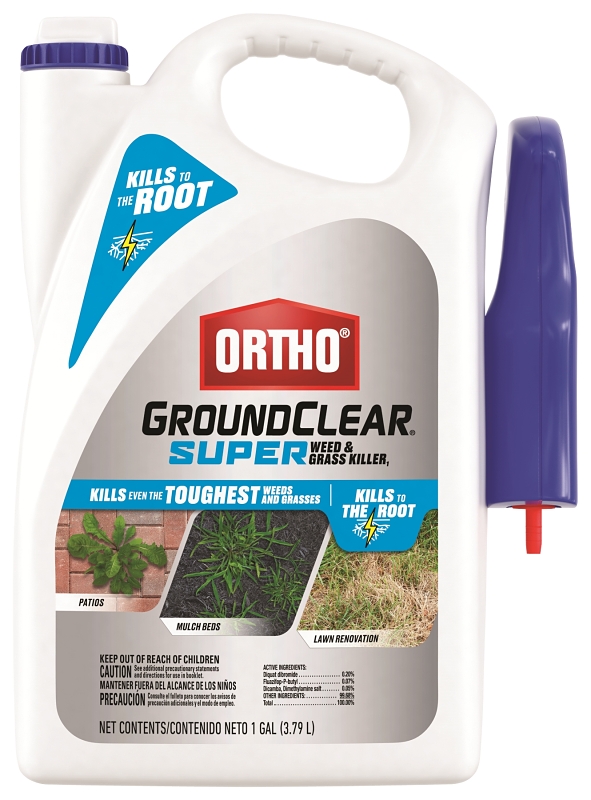 Use Ortho® GroundClear® super weed and grass killer to kill 175 different weed and grass types including crabgrass, dandelion, nutsedge and oxalis. The quick kill, dual-action formula starts working immediately as one ingredient kills on contact while the other penetrates deep into the plant to kill all the way down to the roots. Sprayed weeds usually begin to wilt within hours after being treated, with weeds completely killed in one to two weeks. Apply this ready-to-use weed and grass killer in landscape areas, patios, walkways, gravel, mulched areas, along houses and fence lines and on driveways when weeds are actively growing and the air is calm. It’s easy-to-use, simply turn the sprayer nozzle to the desired setting and squeeze the trigger repeatedly. Rainfall or watering 15 min after application will not reduce the effectiveness of this powerful weed control. A single application of Ortho® GroundClear® super weed and grass killer will start to control even the toughest weeds and grass right down to the roots.
