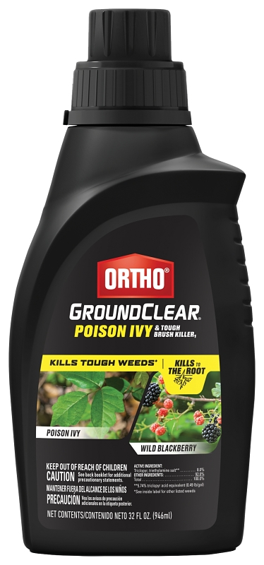 Use Ortho GroundClear poison ivy and tough brush killer1 to kill poison ivy, poison oak and wild blackberry. Also kills honeysuckle, kudzu, ragweeds, dandelion and other weeds as listed. It kills weeds to the roots. Apply this concentrated formula with an Ortho Dial ‘N Spray or a tank sprayer around homes, cabins, buildings, fences and along trails and rails. Wilting or yellowing will occur in 2 to 6 weeks. Ortho groundclear poison ivy and tough brush killer1 contains a proven weed killer that targets brush and vine weeks.