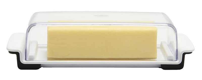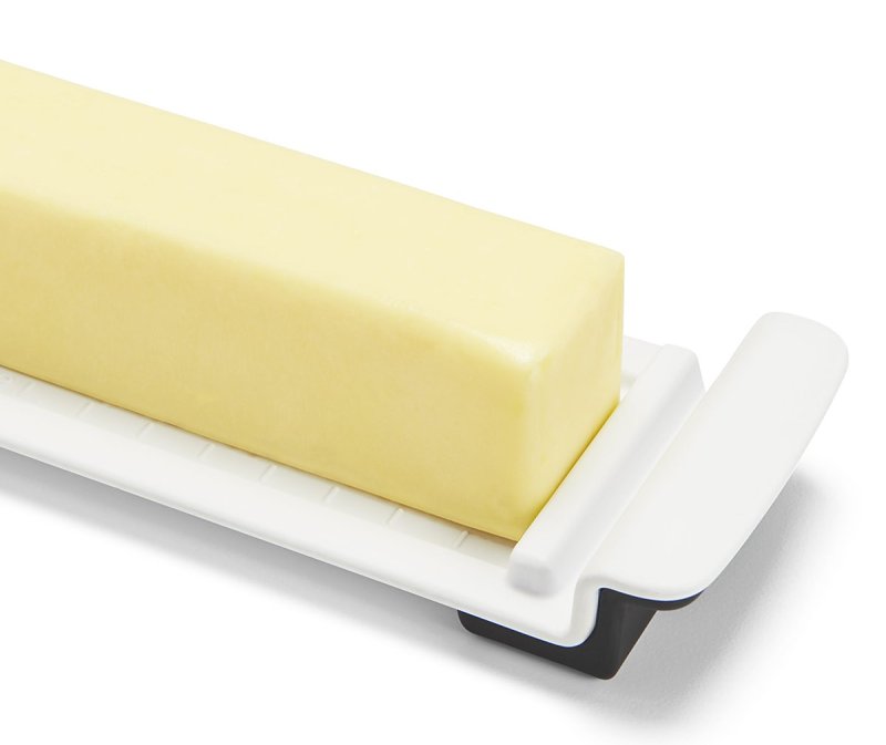 Butter Dish has stoppers on three sides to keep sticks from sliding around as you cut them. Accommodates longer, slimmer sticks (the dominant shape east of the Rocky Mountains) as well as shorter, stouter sticks (commonly found out West), with measurement markings for each.