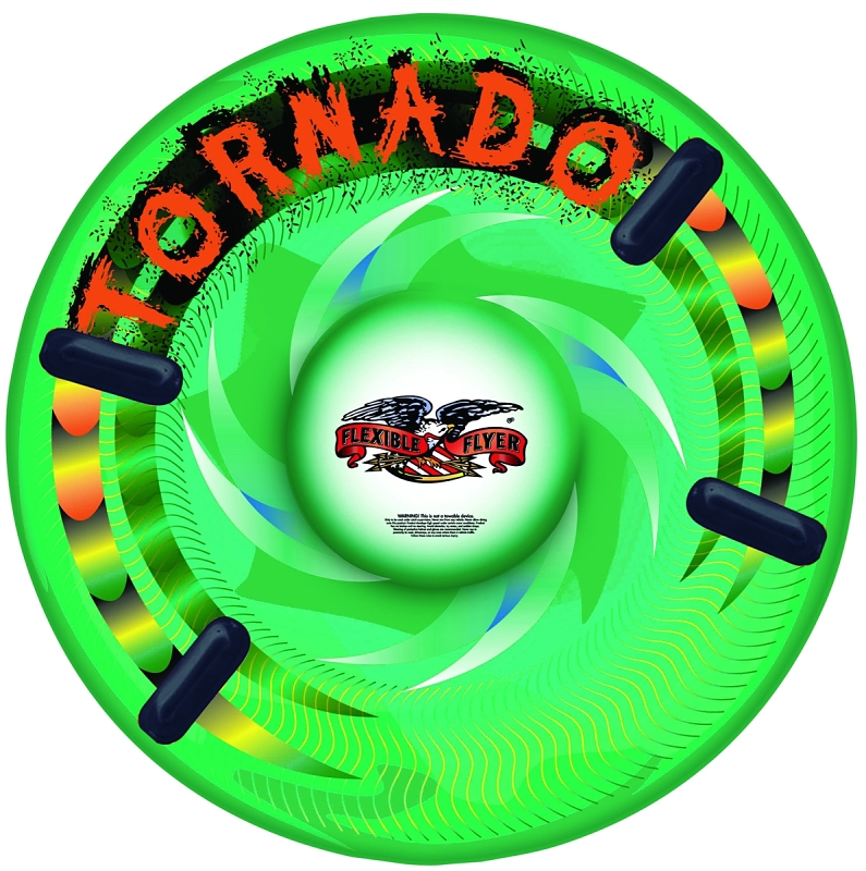 Fun for the whole family, it can be used to cruise down a snowy hill during the winter or to float in the water during the summer. The slick bottom is designed for fast speeds in the snow. The 50 in Dia is large enough for up to 2 riders and it has two sets of sturdy handles. The inflatable tube is made with CPSIA compliant 18 ga PVC. It is green with sharp looking graphics on the top. The tornado is tough and will hold up well. It comes with a repair patch in case it is needed.