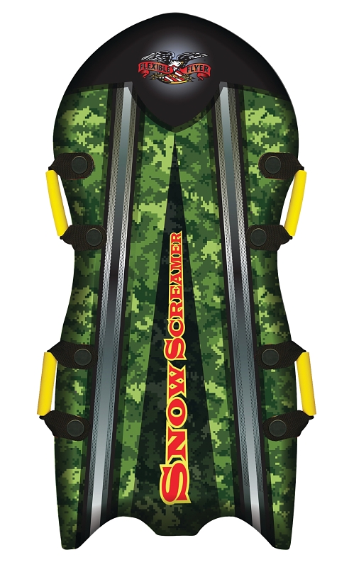 The flexible flyer snow screamer has modern looking graphics and a slick bottom for speed. Enjoy an exhilarating ride down the hill. It is big enough for one or two riders and it has four sturdy handles. This lightweight foam sled is made with polyethylene foam and has a soft foam construction. The laminated top and bottom is crack resistant, even in very cold weather. Since it’s lightweight, it is easy to carry.