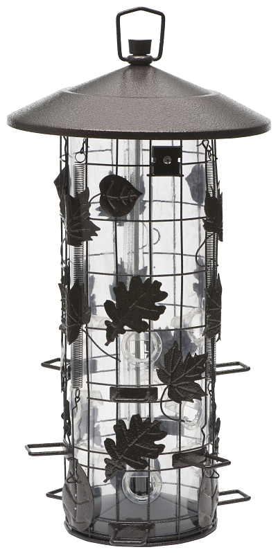 Squirrel proof system with triple tube design uses squirrel’s own weight to block off seed access. Separate 3 cavity design allows for a variety of different seed mixes for 9 feeding stations. Squirrels weight blocks access to food. Adjustable spring tensioner for protection against smaller squirrels.