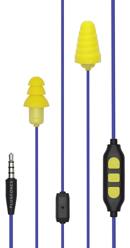 Plugfones Guardian Plus Earphones, Wired, 23/26 dB, 54 in Cable Length, Blue/Yellow, Includes: (1) Pair Interchangeable Foam Plug, (1) Pair Interchangeable Silicone Plug, Cable Management Clip, Guardian Earplug-Earbud Hybrid, Waterproof Case