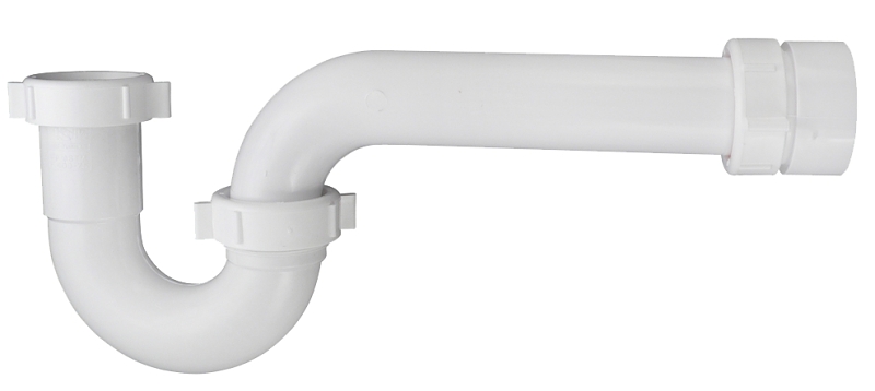 White polypropylene P- trap for kitchen. 1 1/2 in inlet and outlet. Includes marvel connector for connection to SCH.40 stub out. All necessary nuts and washers are included.