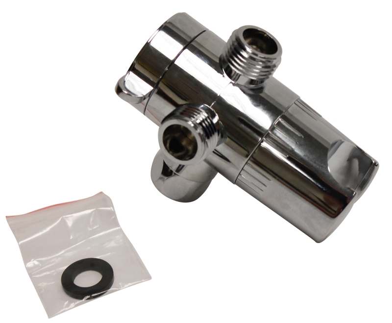 Three-way diverter for wall shower, handheld shower or both. Attaches to standard 1/2 in IPS shower connections. Includes built-in mount for handheld shower. Chrome plastic finish.