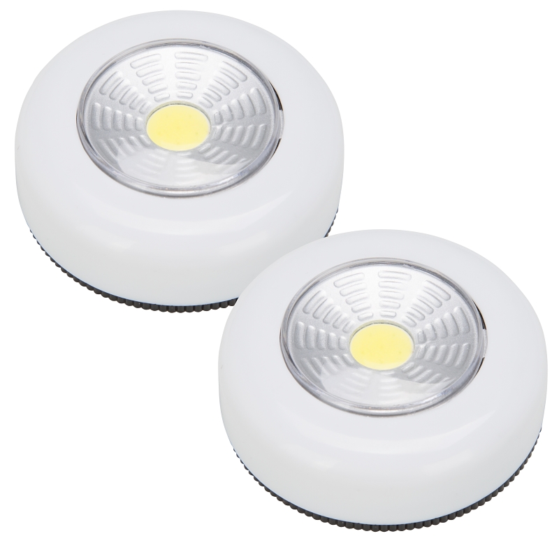 The PowerZone LED puck lights has a beam distance of 10 m, 35 lumens and can run up to 3hrs. It’s easy to install with the included adhesive tape. Features a press down On/Off center. These puck lights are great for kitchen cabinet, closet and book shelves. 3AAA batteries included.