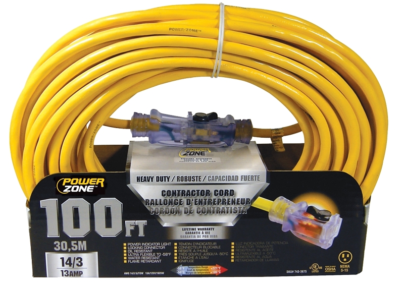 PowerZone Contractor Cord, 125 V, 13 A, Wattage Rating: 1625 W, Cable Size: 14 AWG, Jacket Color: Yellow, Temperature Rating: -58 to 221 deg F, 100 ft L, Amperage Rating: 13 A, Conductor Size: 14 AWG, Number of Conductors: 3, Special Features: Nema 5-15, Pro SJTOW, Usage: For Outdoor Applications