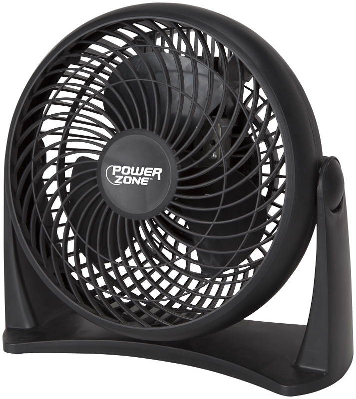 PowerZone Turbo Fan, 120 VAC, 0.7 A, Frequency Rating: 60 Hz, Wattage Rating: 84 W, 3 Speeds, Number of Blades: 3, Blade Diameter: 8 in, Control Type: Rotary, 3, Rotating Angle: 90 deg, Cord Length: 72 in, Plastic Blade, Housing Material: Plastic, Powder-Coated, Black, Table Mounting, Dimensions: 10-3/4 x 10-1/4 x 5-1/4 in, Plastic