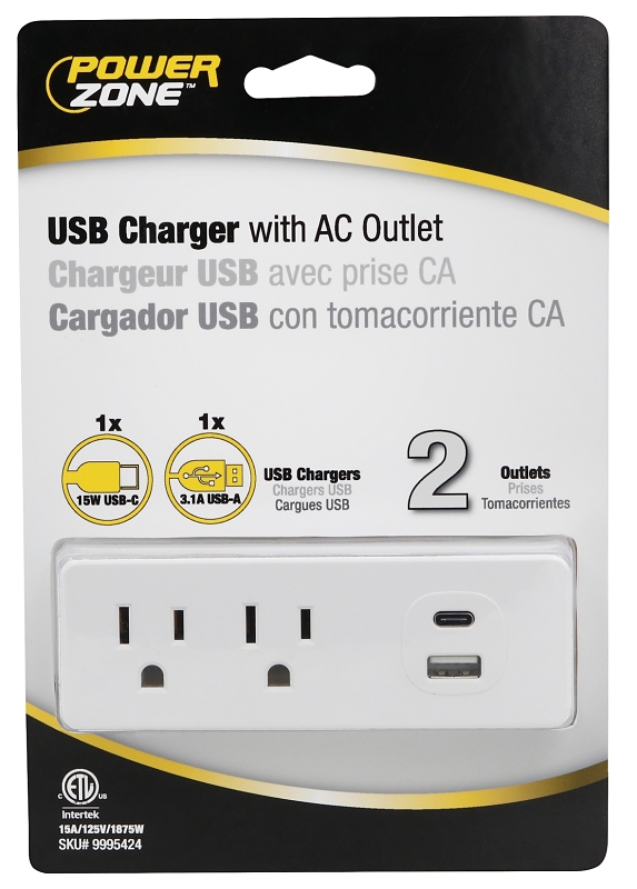You can diversify your power source with this 2-outlet wall tap with 2 USB ports. It features 2 grounded AC outlets, and USB ports. The plug-in tap transforms your regular outlet into a safe, multi purpose charging station. The space-saving wall tap provides easy access to plugging in multiple items at one time which is ideal for any room in your home, regardless of size or setup. This outlet features an integrated circuit breaker for overload protection. You can be rest assured that your electronics are protected from damaging voltage spikes. Because of it’s white color, this wall tap ensures your powering station does not distract from your room’s interior design. For even more convenience, the tap can be simply plugged into a duplex outlet for temporary use. Use the wall tap as part of your permanent home or office setup or, for holidays and special occasions, create a centralized location for powering a room’s worth of electronic lights and decorations. Organize your electronics with the PowerZone 2-outlet wall tap.