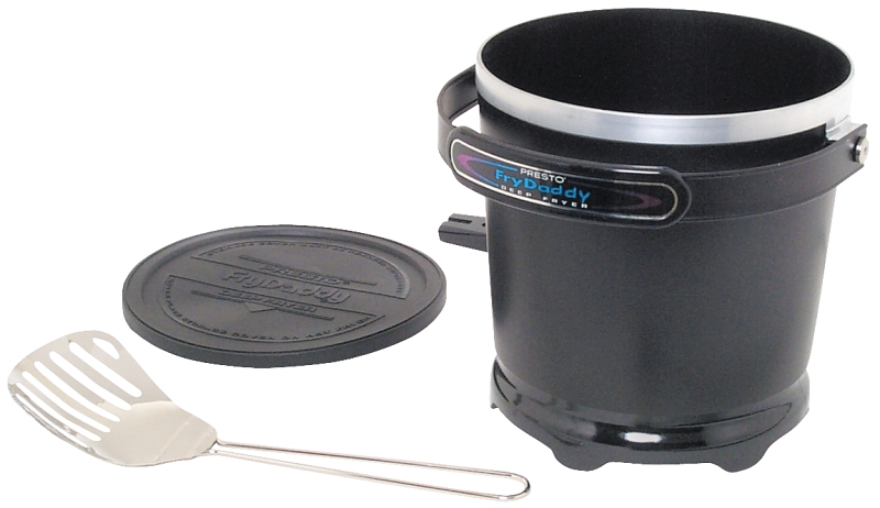Fries 4 generous servings with just 4 cups of oil. Ideal frying temperature is maintained automatically. Scoop separates, stirs, lifts, drains and serves for no messy basket to clean. Snap-on lid stores oil for reuse without spills or odor. Heavy cast aluminum body. Non-stick surface inside and out for easy cleaning. 120 VAC, 1200 W. UL listed.