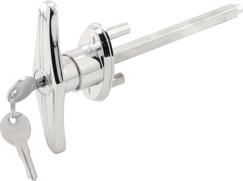 Zinc die-cast construction, keyed lock, 5/16 in square shaft, 4-5/8 in long, 1-1/2 in hole centers, replaces many garage door, camper and R.V locking handles. Screws attach to lock from the inside of door. Contains 1 locking handle, 2 keys.