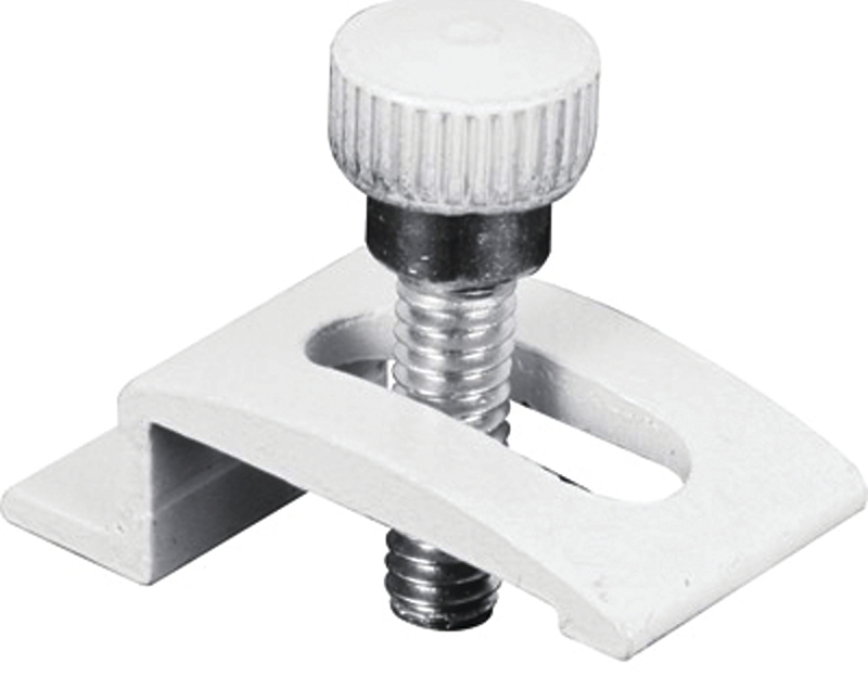 Extruded aluminum clips for attaching storm window panels to storm doors. Includes 8 clips and 8 screws. 3/4 in L x 1/2 in W.